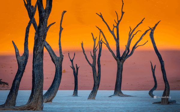 세계에서 가장 오래된 사막인 나미브 한가운데에는 아프리카에서 가장 매혹적인 풍경 중 하나인 나미브-나우클루프트 국립공원의 "백토 팬"으로도 알려진 데드블레이가 있습니다. 최대 300m 높이의 붉은 모래 언덕으로 둘러싸인 이곳은 마치 다른 행성에서 온 것처럼 보이며 나미비아에서 가장 유명한 사진 모티브 중 하나입니다. 세계에서 가장 높은 모래 언덕 한가운데에는 초현실주의 설치 미술을 연상시키는 신비한 검은 실루엣이 솟아오른다. 오늘 사진에서 볼 수 있듯이 수백 년 된 죽은 낙타 가시나무는 오래 전부터 이 고대 풍경의 시대를 초월한 아이콘이 되었으며 전 세계의 사진가들을 끌어 모으고 있습니다. 900년이 넘는 세월 동안 사막의 건조함과 염분이 많은 토양으로 인해 부패하지 않았습니다. 지난 세기의 침묵의 증인으로서 그들은 특별한 문화적 의미를 지니고 있습니다. 이 지역은 모험가, 등산객, 자연 애호가들에게 인상적인 여행지입니다.