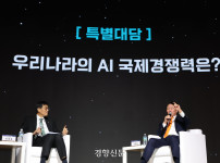 서울 중구 대한상공회의소에서 5일 열린 한국은행, 대한상공회의소 공동주최 ‘AI 기반의 성장과 혁신’ 세미나에서 최태원 대한상공회의소 회장(오른쪽)과 이창용 한국은행 총재가 대담을 나누고 있다. 한수빈 기자