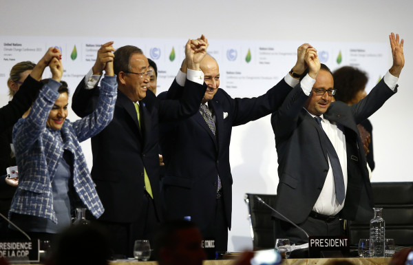 2015년 12월12일(현지시간), 프랑스 파리에서 열린 제21차 유엔기후변화협약 당사국총회(COP21)가 폐막한뒤 크리스티아나 피게레스 전 유엔기후변화협약(UNFCCC) 사무총장, 반기문 전 유엔 사무총장, 로랑 파비우스 프랑스 외무장관 겸 COP21 의장, 프랑수아 올랑드 프랑스 당시 대통령이 함께 손을 들어올리고 있다. AP연합뉴스