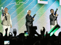 젠슨 황, 한국에 AI칩 26만장 푼다…삼성∙SK∙현대차와 ‘AI 동맹’  젠슨 황 엔비디아 최고경영자와 이재용 삼성전자 회장, 정의선 현대차그룹 회장이 30일 서울 코엑스에서 열린 엔비디아의 그래픽카드(GPU) ‘지포스’ 출시 25주년 행사 단상에 올라 퍼포먼스를 하고 있다. 연합뉴스